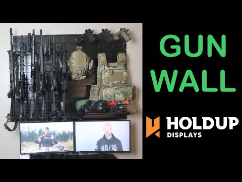 What I consider the best gun wall mount system, Hold Up Displays HD90. This gun wall is high quality, easy to install, holds 6 rifles, 6+ pistols, plate carrier, and lots of accessories. The key is to find the studs in the wall to support the weight of the gun wall.